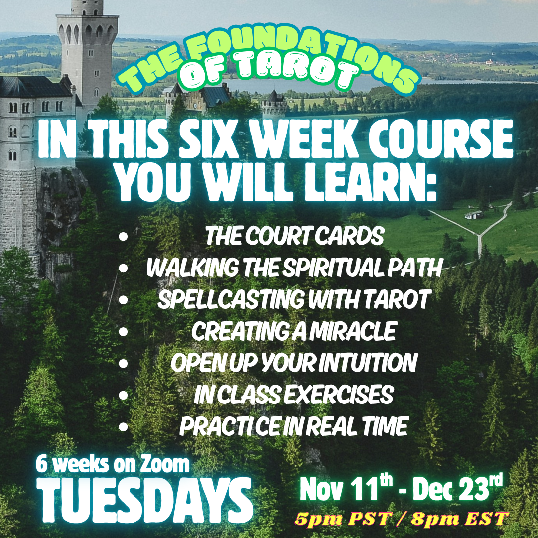 This experience will include all the whimsy and magic of your standard Tarot class — intuitive energy reading, in-class exercises, fun and innovative lecture styles, and the heartwarming love of a spiritual community.